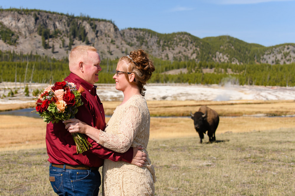 As amazing as all the scenery and animals were during our summer in Yellowstone, nothing compares to our wedding at Old Faithful. We had planned on getting married in Texas this winter, but fell in love with Yellowstone so much we decided to get married there. While leading up to the wedding, a lot of things didn’t go right, and we had to change plans. But on our wedding day, everything went absolutely perfectly. The timing of Old Faithful going off behind us during the ceremony was right on time.