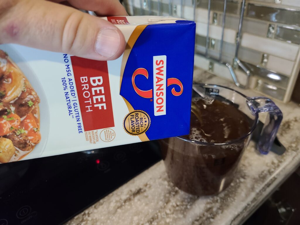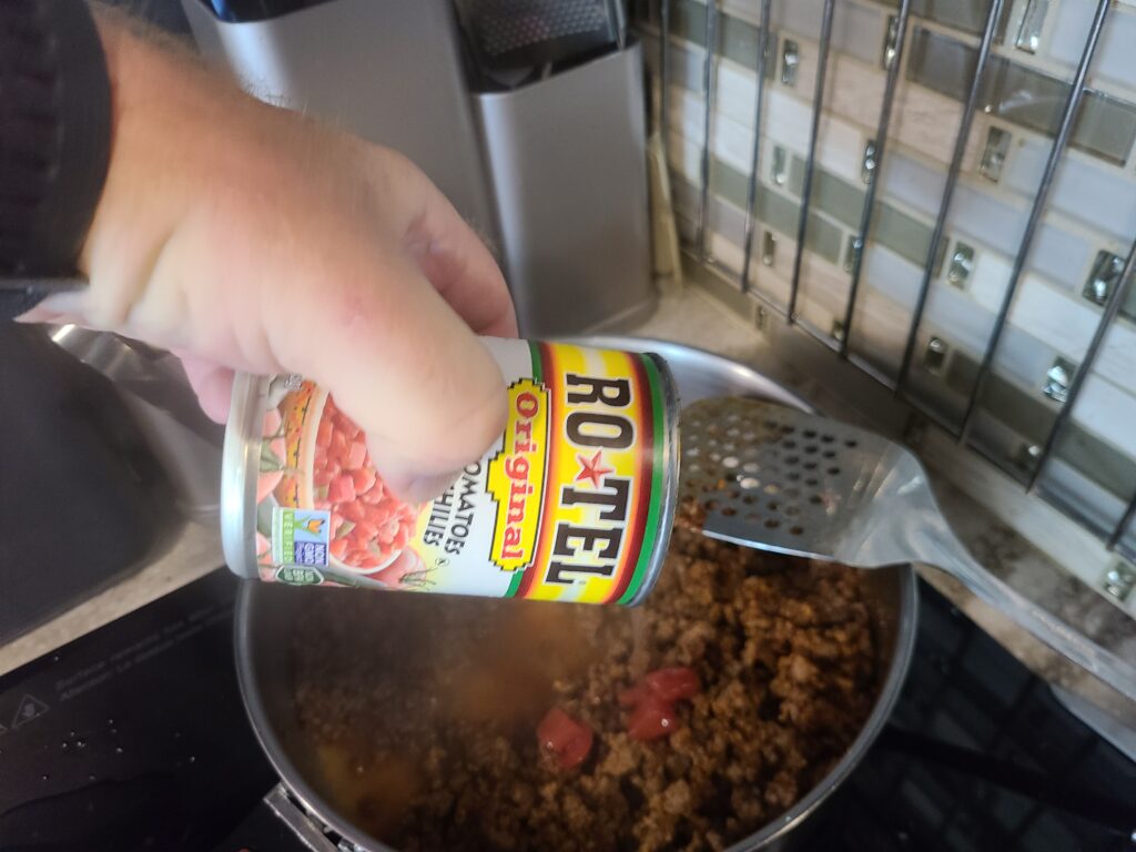- Stir in taco seasoning, Rotel, beef broth, and macaroni.