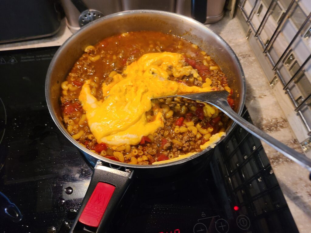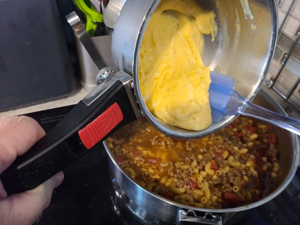 - Pour cheese sauce over the hamburger mixture and stir gently to combine.