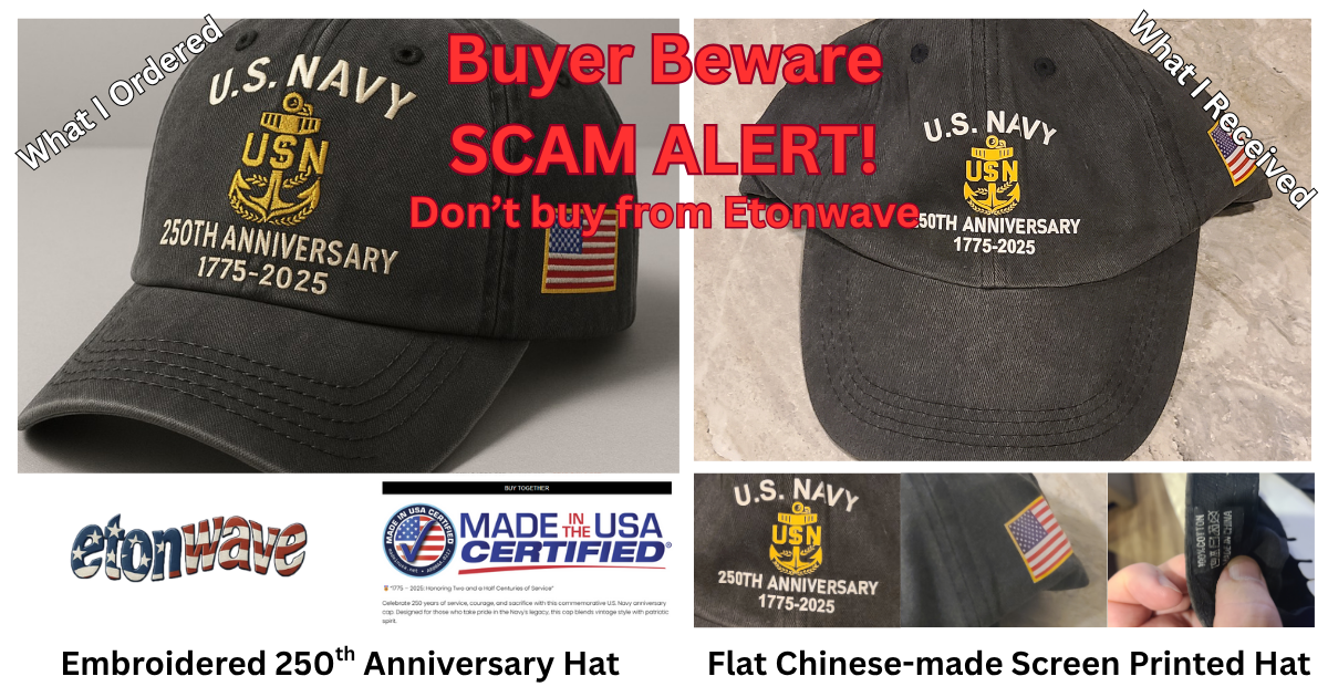 I consider myself a bit of a hat snob. So when I saw a sharp-looking U.S. Navy hat advertised as embroidered and made in the USA by a company called Etonwave, I placed my order without hesitation. Unfortunately, what followed was a classic Etonwave hat scam — the kind of bait-and-switch experience every online shopper dreads. In this post, I’ll break down what I ordered, what I actually received, and why you should think twice before buying military-themed gear from Facebook ads.