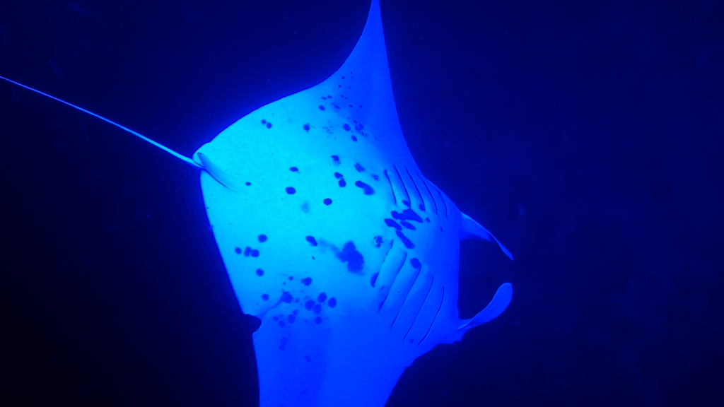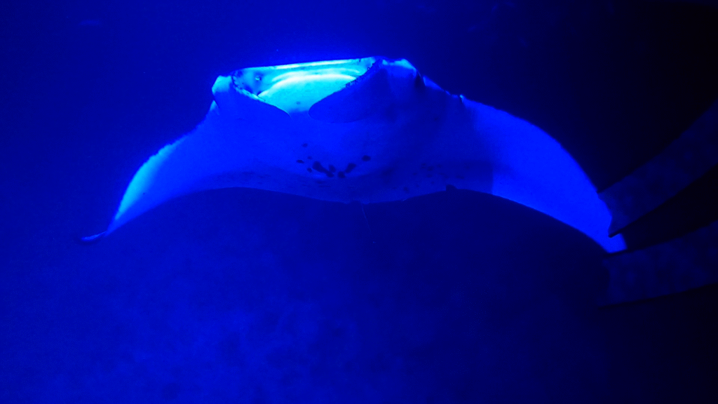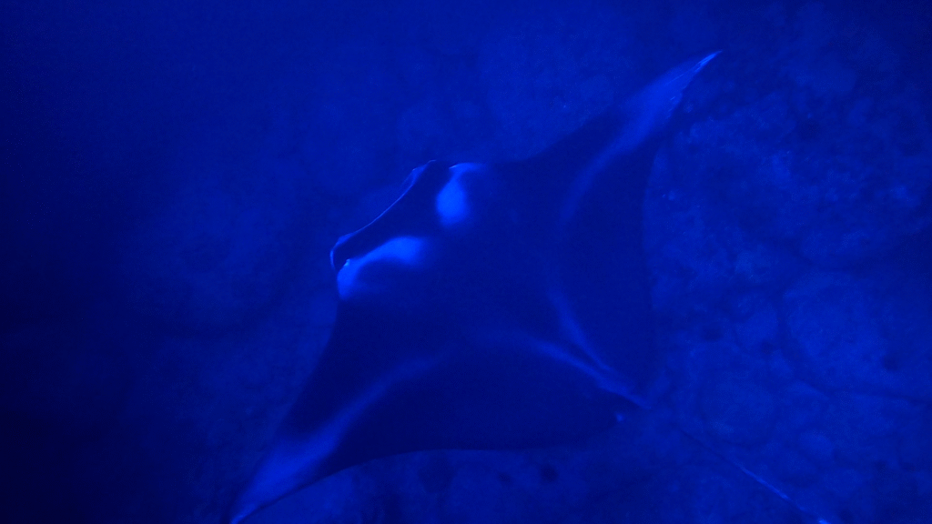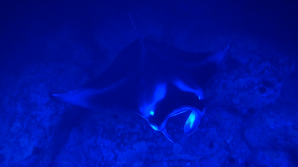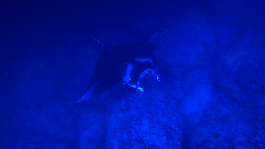 The evening started calmly, with just a few fish darting around in the light below our floating platform. The anticipation grew, and before long, the main attraction arrived. A massive manta ray emerged from the darkness, swooping gracefully beneath us. Then another joined, and then another, until three rays were taking turns looping, flipping, and circling just inches away.
