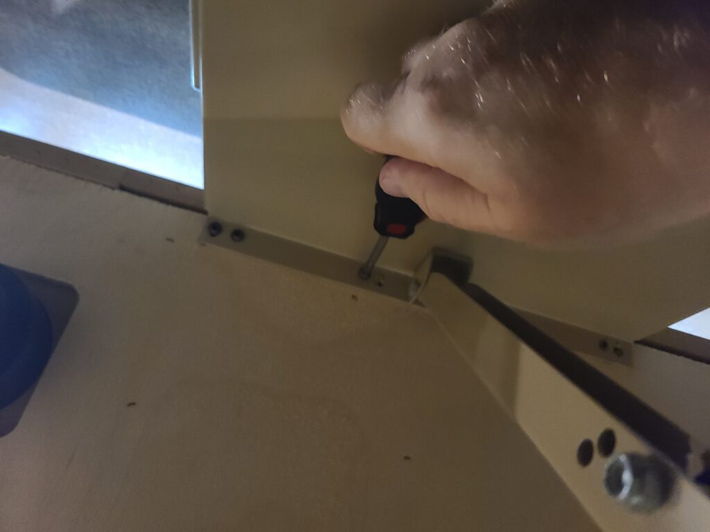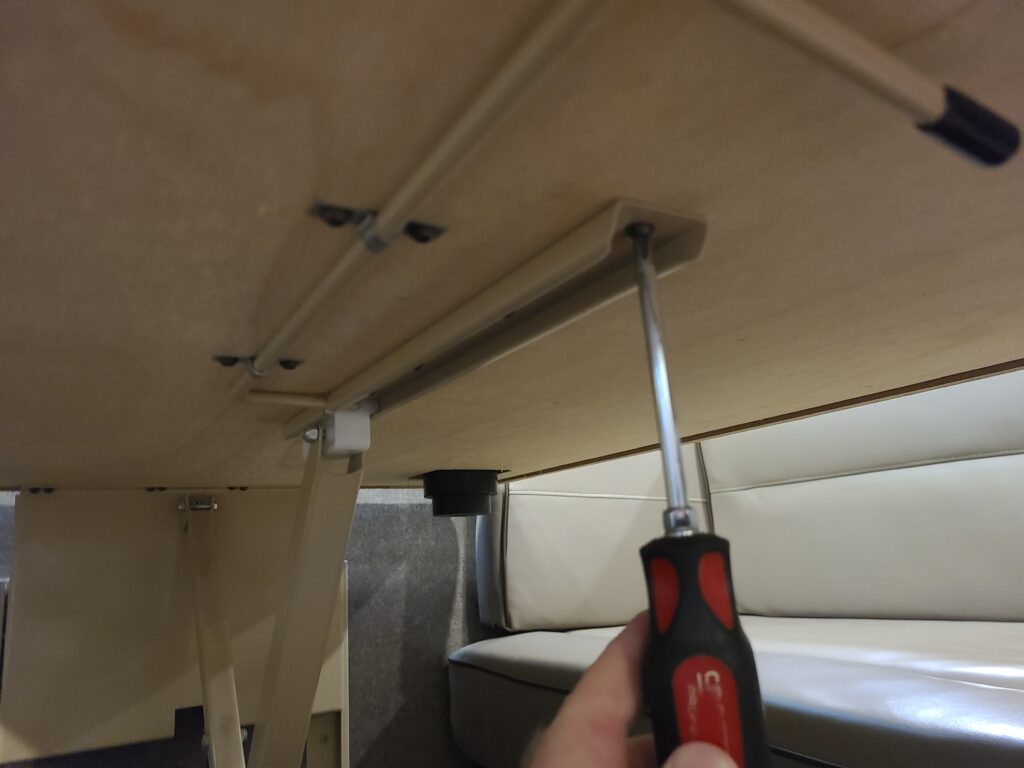 Installing the new table took a little more effort. With the extra weight and thickness, it was definitely a two-person job. Lisa held the new table steady while I worked to get the alignment just right.